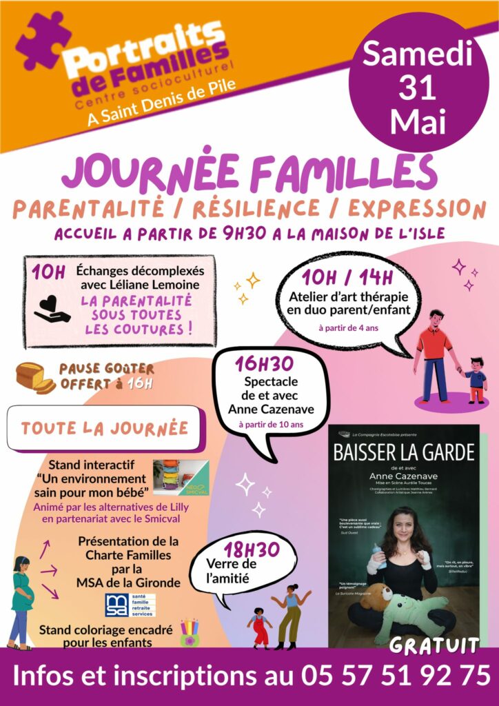 Rendez-vous au pôle culturel de Boma à Saint Denis de Pile pour ce second atelier en partenariat avec Portraits de Famille le samedi 31/05/2025 à 10h dans le cadre de la journée Familles.